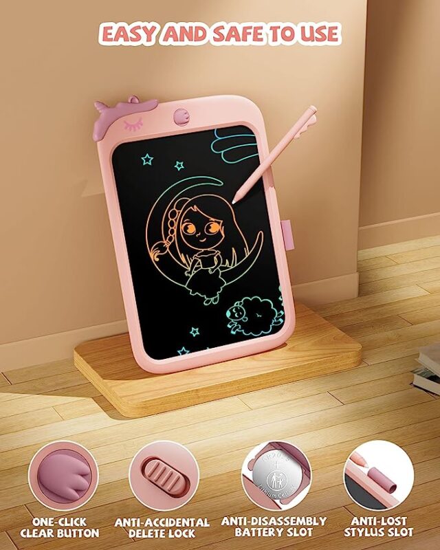 • 💖Eye Protection & No Mess at Home: The advanced colorful LCD writing tablet does not emit dangerous radiation that can damage the eyes. This writing tablet helps you avoid messy cleanups and the use of harmful chemicals. It is environmentally friendly by eliminating the need for paper, chalk, crayons, and pencils. Simply erase your content quickly with one press of the erase button!