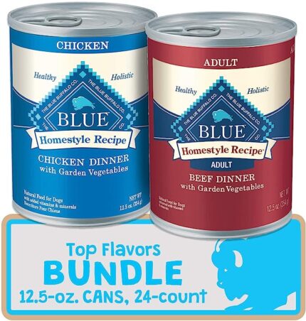 • Contains twenty four (24) 12.5-oz cans of BLUE Homestyle Recipe Natural Adult, Chicken or Beef